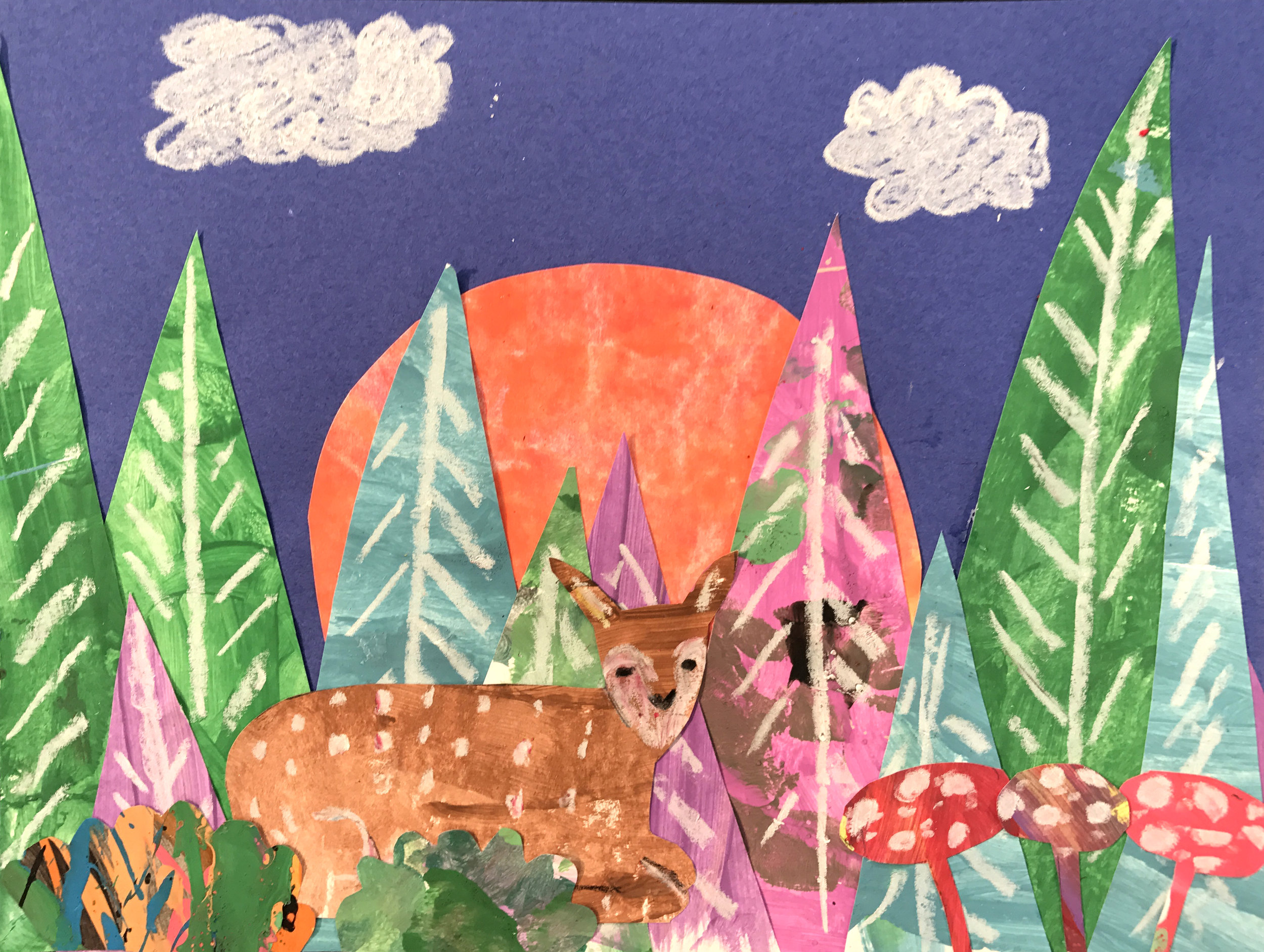 2. Draw your animal on a piece of collage paper. Cut it out and glue it down. Use oil pastels to fill in details.